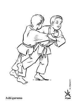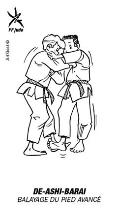 Uke est en déséquilibre avant droit. Tori place sa jambe droite tendue devant la jambe droite adverse, au niveau du genou. Chute en cercle d'Uke par-dessus la jambe de Tori. (Méthodes comparées - C. Thibault)