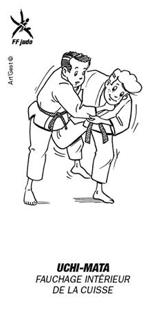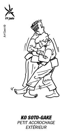 Tori provoque chez Uke un déséquilibre arrière droit. Avec le pied gauche il crochette et fauche en arrière l'extérieur de la jambe droite. Uke chute sur le dos. (Méthodes comparées - C. Thibault)