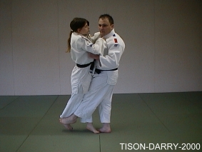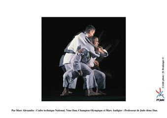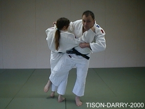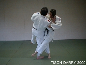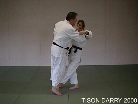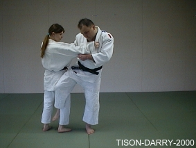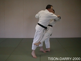 Mettre Uke en déséquilibre avant droit. Avec son pied gauche Tori bloque la jambe droite adverse à la hauteur du genou. Le corps d'Uke pivote autour de son genou droit qui sert d'axe. (Méthodes comparées - C. Thibault)