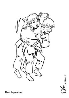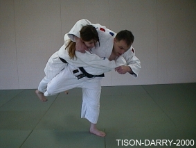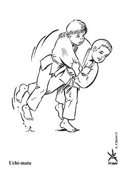 Mettre Uke en déséquilibre avant droit. Tori barre le crops adverse avec sa jambe droite et entoure le cou d'Uke avec son bras droit. Ce dernier pivote autour de la cuisse de Tori et chute sur le dos. (Méthodes comparées - C. Thibault)