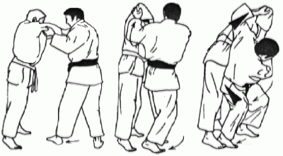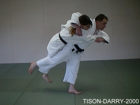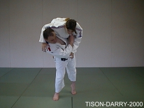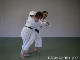 Mettre Uke en déséquilibre avant. Tori saisit la ceinture adverse dans le dos, soulève le corps d'Uke avec son bras droit et le projette devant lui en tournant les hanches. (Méthodes comparées - C. Thibault)