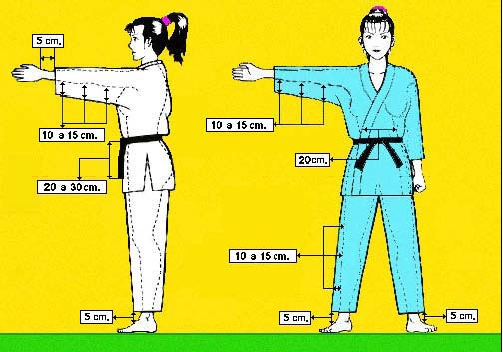 e) Une ceinture de 4 à 5 cm de large en fort tissu sera nouée par-dessus la veste ; cette ceinture sera d’une couleur correspondant au grade du combattant et sera nouée par un noeud plat au niveau de la taille en faisant deux fois le tour de celle-ci. Les pans de la ceinture seront d’une longueur de 20 à 30 cm. La ceinture devra être suffisamment serrée pour éviter que la veste ne sorte de celle-ci.